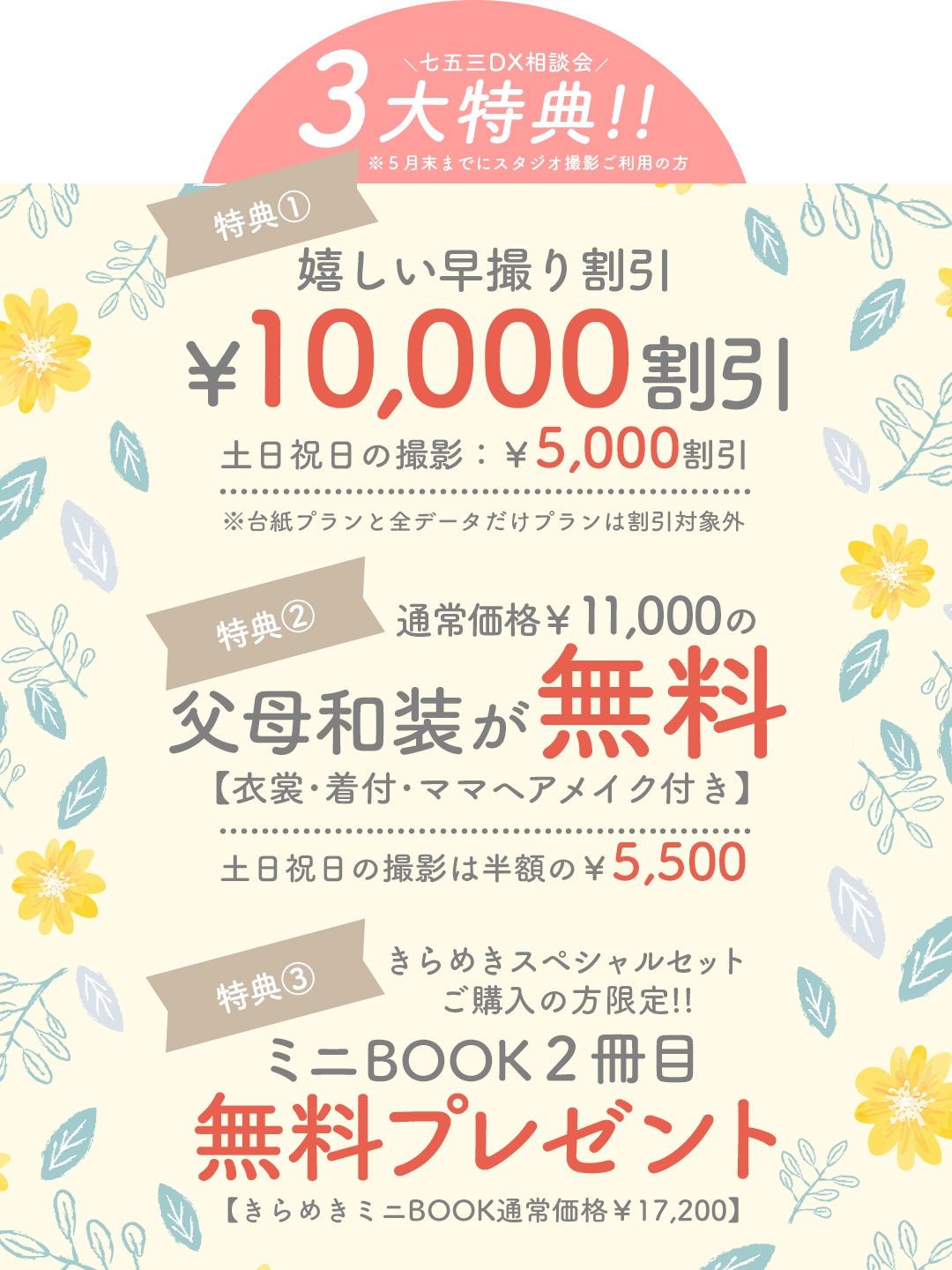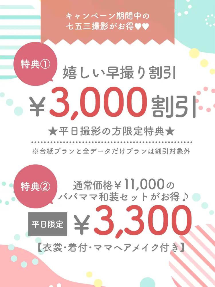 七五三撮影が初めての方も、経験がある方も、まずはココから!たくさんの衣装の中からお気に入りを見つけられることはもちろん、七五三の料金システムや秋のお参りについてのご説明など、七五三の全てがここで解決♪