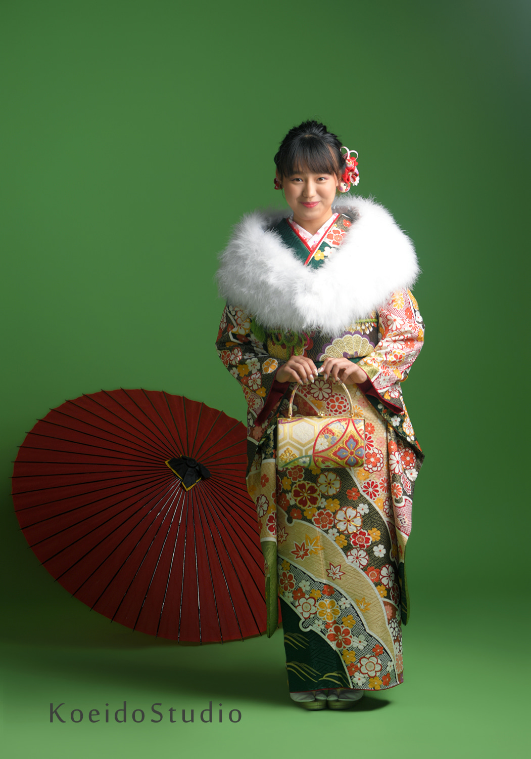 緑の振袖と綺麗にマッチしています