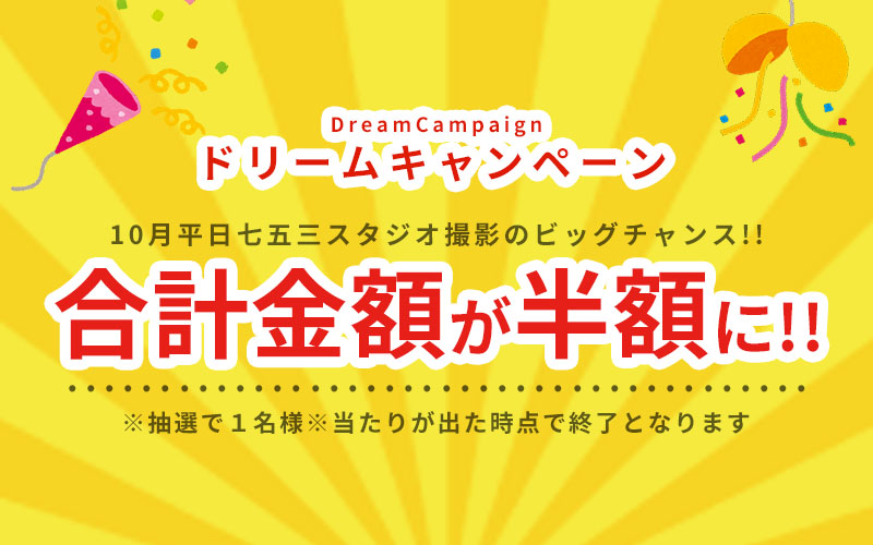 10月の平日に七五三スタジオ撮影をしていただくと、抽選で1名様に七五三スタジオプランの合計金額から半額になるキャンペーンを開催します🎉
