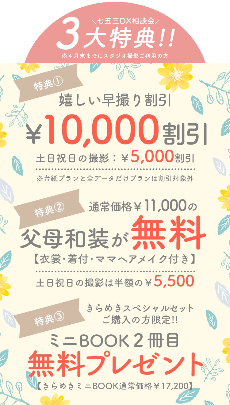 七五三撮影が初めての方も、経験がある方も、まずはココから!たくさんの衣装の中からお気に入りを見つけられることはもちろん、七五三の料金システムや秋のお参りについてのご説明など、七五三の全てがここで解決♪